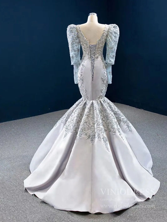 <transcy>Vestido de fiesta plateado de manga larga Vestidos de fiesta de sirena vintage FD2433</transcy>