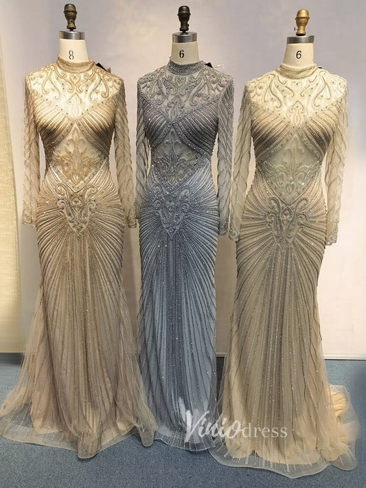 Vestidos de noche con cuentas de lujo, cuello alto, manga larga, vestido para madre de la novia 20019