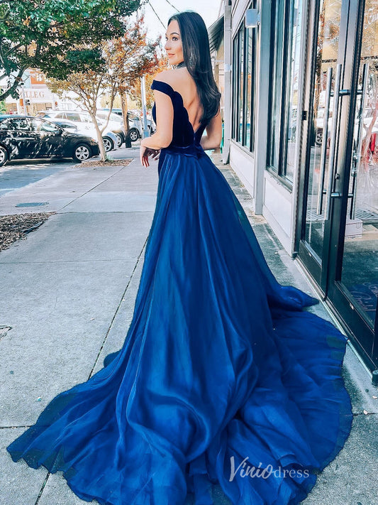 Vestidos de fiesta de sirena de terciopelo azul marino sobrefalda de organza con hombros descubiertos FD4056