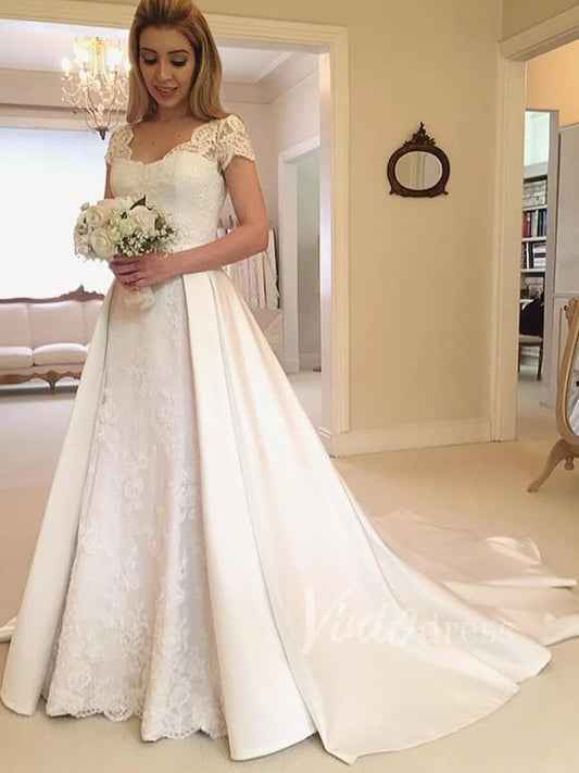 <transcy>Vestidos de novia modestos de encaje con cola desmontable VW1246</transcy>