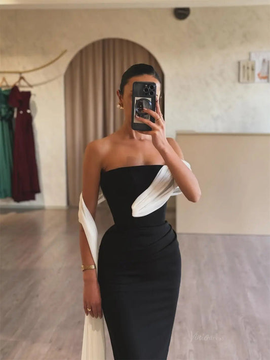 Vestidos de fiesta sirena de satén negro 2025, vestidos formales sin tirantes con mangas drapeadas FD5233