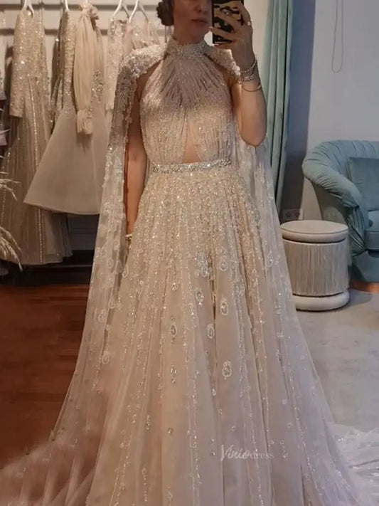 Vestido de novia con cuentas color champán, hombros descubiertos, manga larga, 67241, largo hasta el suelo