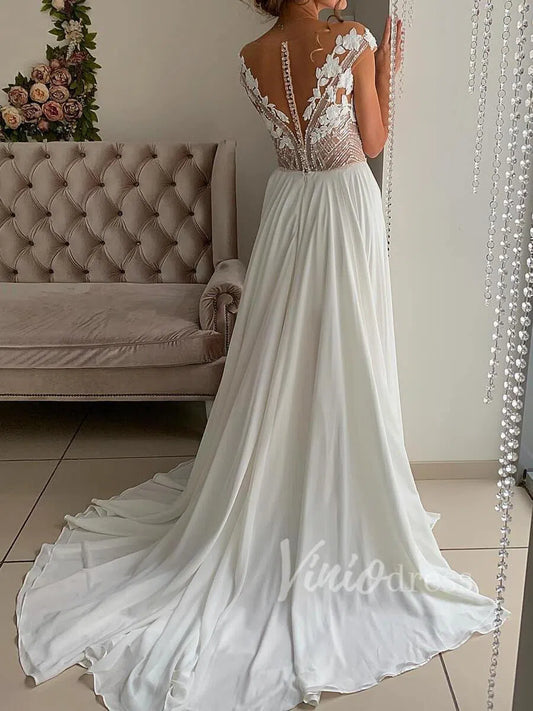 <transcy>Vestidos de novia de playa de gasa con cuentas y abertura lateral VW1260</transcy>