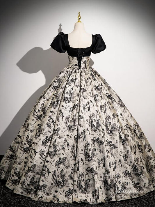 Vestidos de fiesta negros con estampado floral, mangas abullonadas, escote cuadrado y diseño de jacquard para quinceañeras BG039