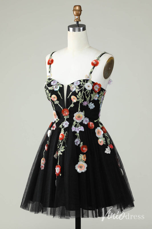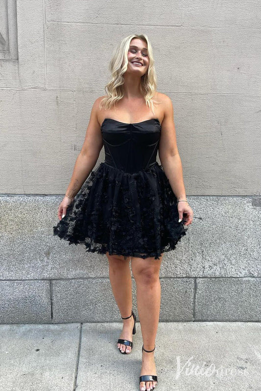 Vestido de fiesta negro floral con escote corazón y sin tirantes, vestido de graduación SD1649