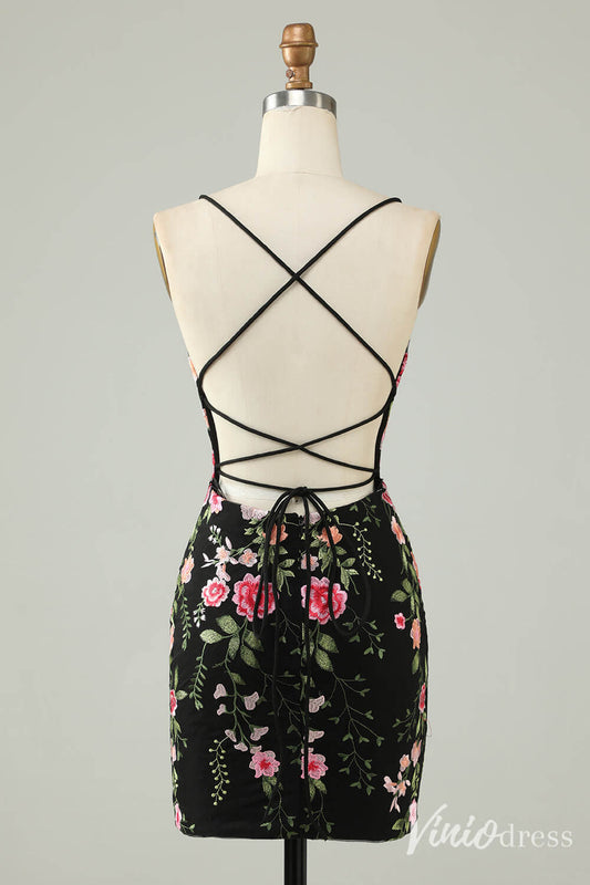 Vestido de fiesta negro con tirantes finos y estampado floral, con apliques de encaje, para la vuelta al cole S24083