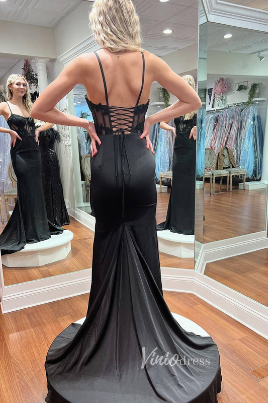 Vestido de fiesta con apliques de encaje negro y tirantes finos, ajustado, S24008