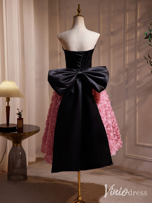 Vestido de fiesta con roseta en negro y rosa, sin tirantes, con lazo, largo hasta la rodilla, BJ038