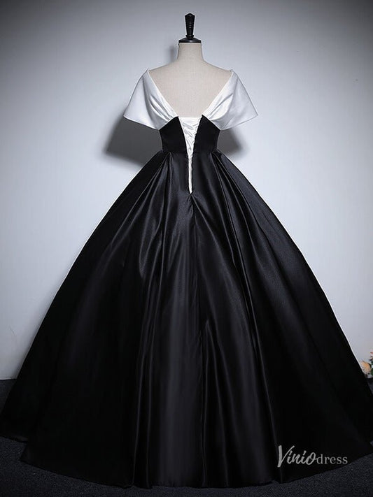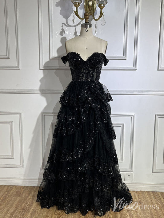 Vestido de novia negro brillante con apliques de encaje y hombros descubiertos para quinceañera 241059