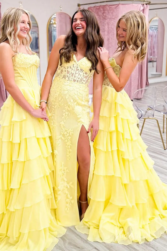 Vestidos de fiesta amarillos con hombros con volantes y corpiño plisado con abertura FD3981