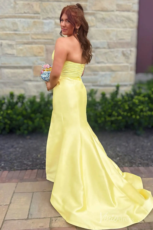 Vestido de fiesta amarillo de satén sin tirantes, con sobrefalda de lazo y abertura – Estilo FD6062