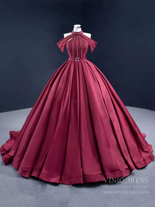 Vestido de fiesta de satén burdeos con hombros descubiertos y cuello alto para quinceañeras 67249 viniodress