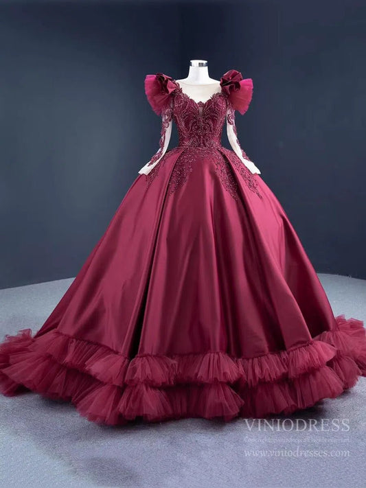 Vestidos de quinceañera color burdeos 66991 Escote en V, manga larga
