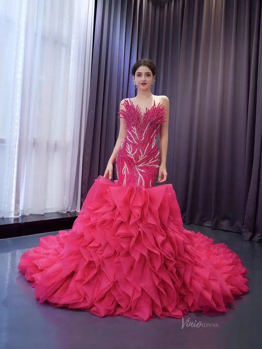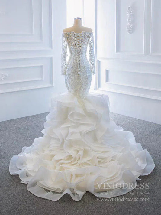 Vestido de novia de sirena con volantes y pedrería y cola larga VINIODRESS