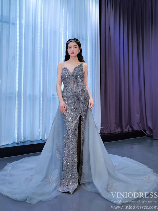 Vestidos de novia de lujo con falda gris y abalorios con abertura