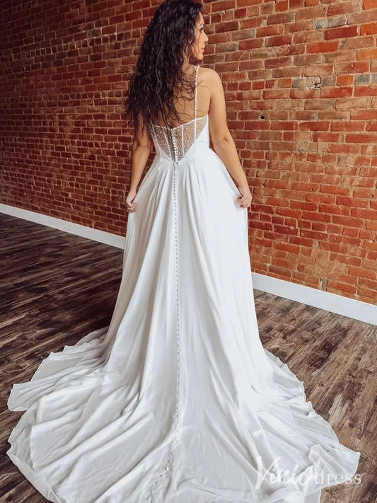 Minimalist A-Line Crepe Wedding Dress | Plunging V-Neck Backless Gown with Chapel Train– VW2599