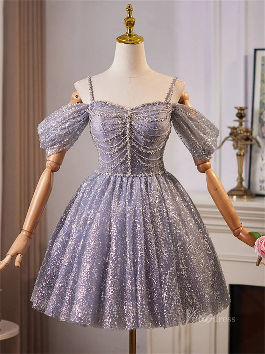 Vestido de fiesta corto con tirantes finos y hombros descubiertos, color lavanda brillante, BJ066