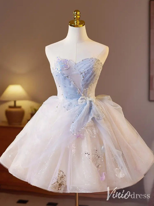 Vestido de fiesta azul etéreo de Cenicienta: vestido de fiesta de tul con lentejuelas, sin tirantes, con sobrefalda y apliques 3D BJ072