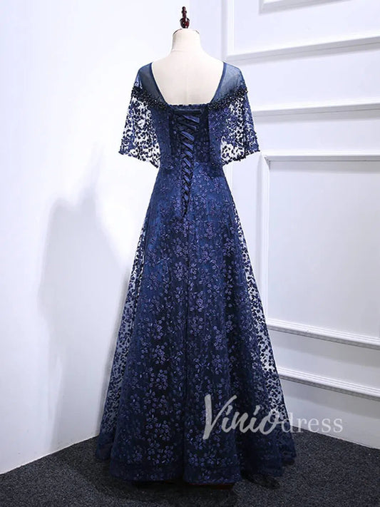 <transcy>Vestidos de madrina de encaje azul marino con mangas FD1520</transcy>