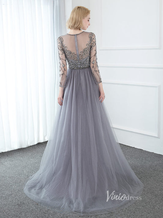 <transcy>Vestidos de fiesta de tul con cuentas de manga larga Vestido formal de una línea con cuello en V FD2381</transcy>