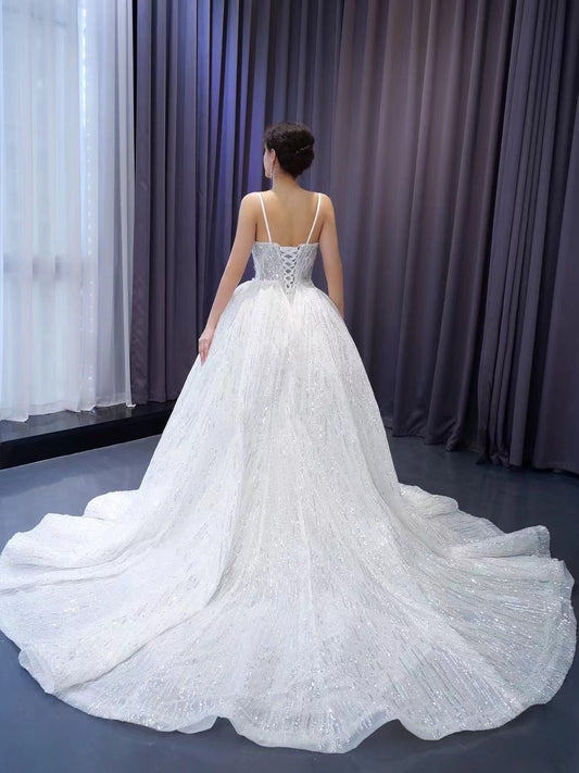 Vestidos de novia sirena de lentejuelas brillantes con cola desmontable y tirantes finos 231049