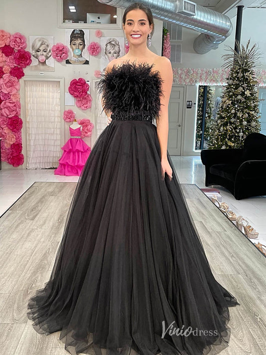 Vestidos de fiesta de tul sin tirantes negros con corpiño de plumas y cintura con cuentas FD3989