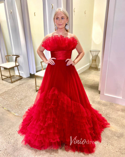 Vestidos de fiesta con volantes en niveles rojos Vestido formal sin tirantes FD3633