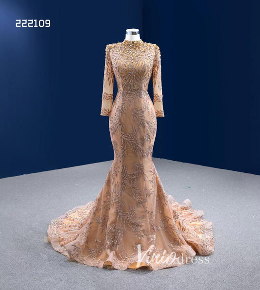 Vestido de novia modesto de sirena dorada, cuello alto, vestido de desfile de manga larga 222109