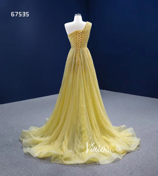 Un hombro amarillo baile de graduación con cuentas vestido de desfile vestidos formales 67535