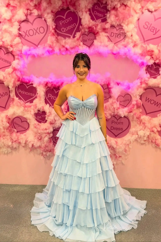 <transcy>Sparkly Dusty Rose Vestidos de baile Vestido de fiesta junior con volantes en capas FD1017B</transcy>