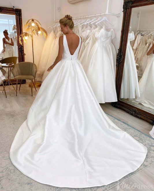 Vestido de novia campestre de satén marfil con sobrefalda con abertura y escote en V, AW1009