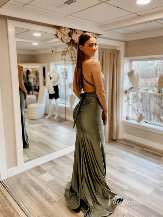Vestidos de fiesta de satén de sirena verde oliva vestido de noche con cuello en V FD2662