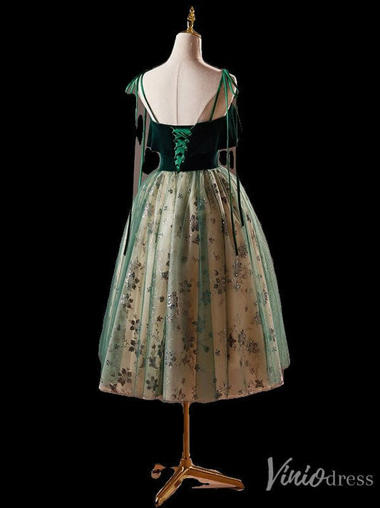 Vestido de fiesta de terciopelo con tirantes finos y encaje verde brillante para graduación 8016