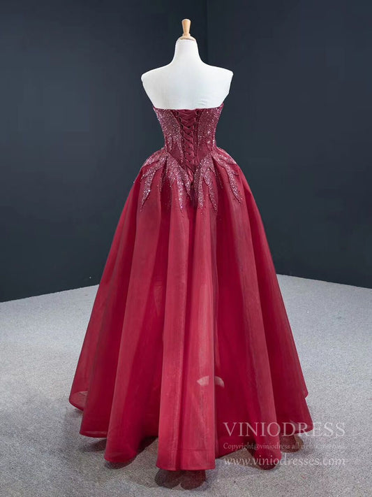 <transcy>Vestidos de fiesta largos de color rojo oscuro sin tirantes Vestido de noche brillante de una línea FD2000</transcy>