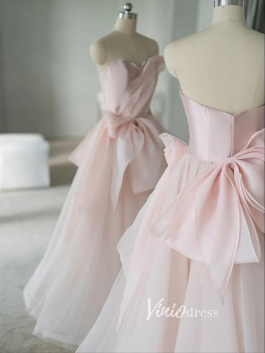 Pink Strapless Satin Prom Dress with Sweetheart Neckline, Bow Detail, and Slit – FD6161
