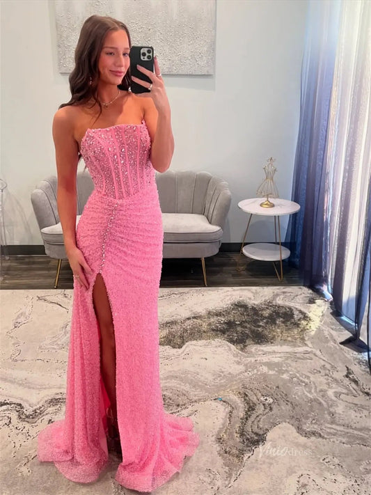 Vestidos de fiesta de sirena de satén rosa sin tirantes 2025 con abertura, escote corazón con cuentas y corpiño transparente con ballenas – FD5056