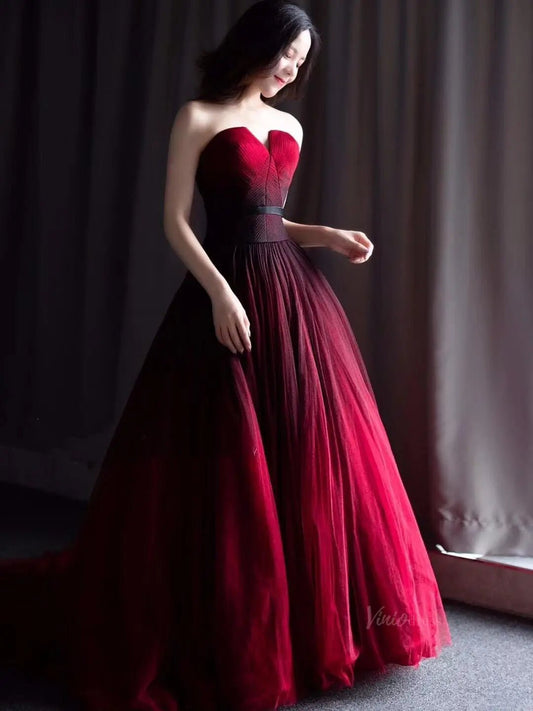 Vestidos de fiesta de tul rojo degradado sin tirantes para quinceañera SU052