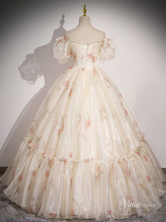 Vestidos de fiesta florales color champán con hombros descubiertos y organza para quinceañera BG048