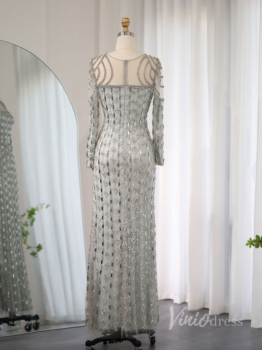 Vestido de fiesta de sirena con cuentas grises, manga larga y cuello barco, AD1191