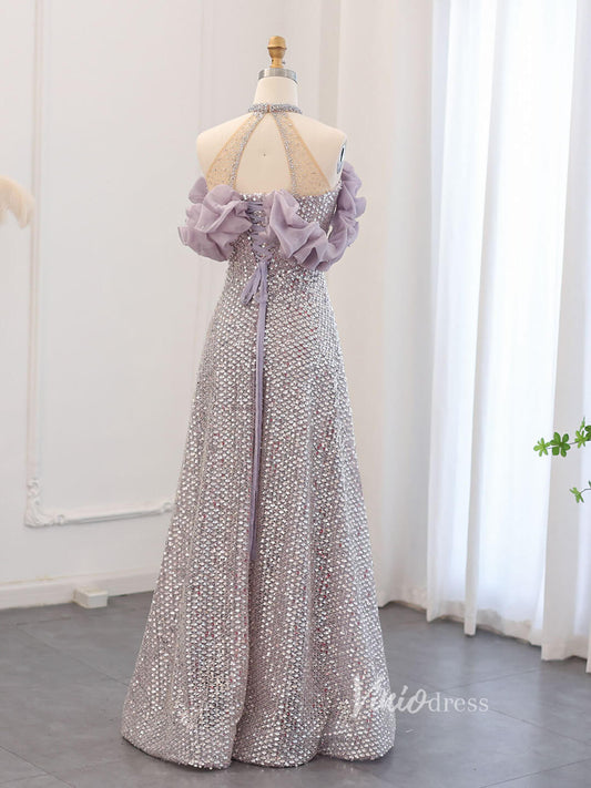 Vestido de fiesta con volantes y cuentas en color malva, vestido de noche con cuello halter AD1178