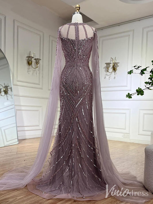 Vestido de fiesta de sirena con cuello alto y mangas desmontables con cuentas y capa AD1253