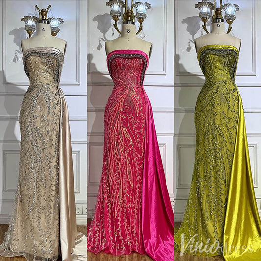 Vestido de fiesta de sirena con encaje y cuentas, sin tirantes, con sobrefalda de satén, para desfile, 2021
