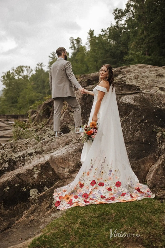 Ivory Tulle Wedding Veil with Colorful Floral Embroidered Edge, Chapel Length – VV002