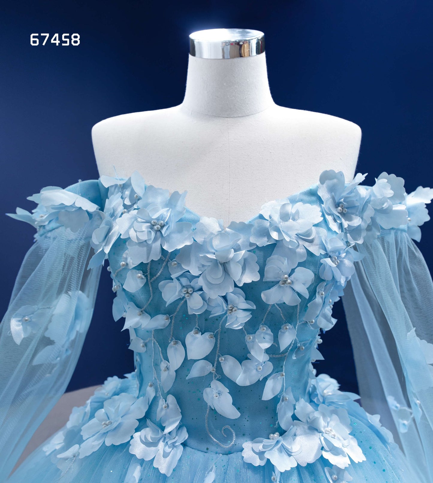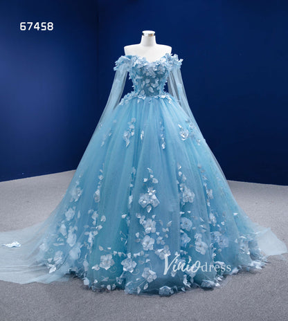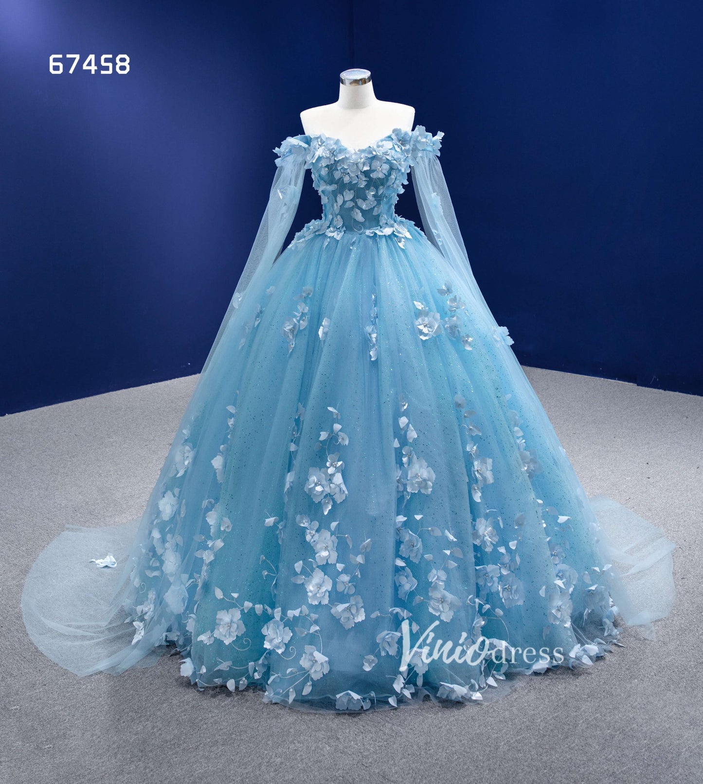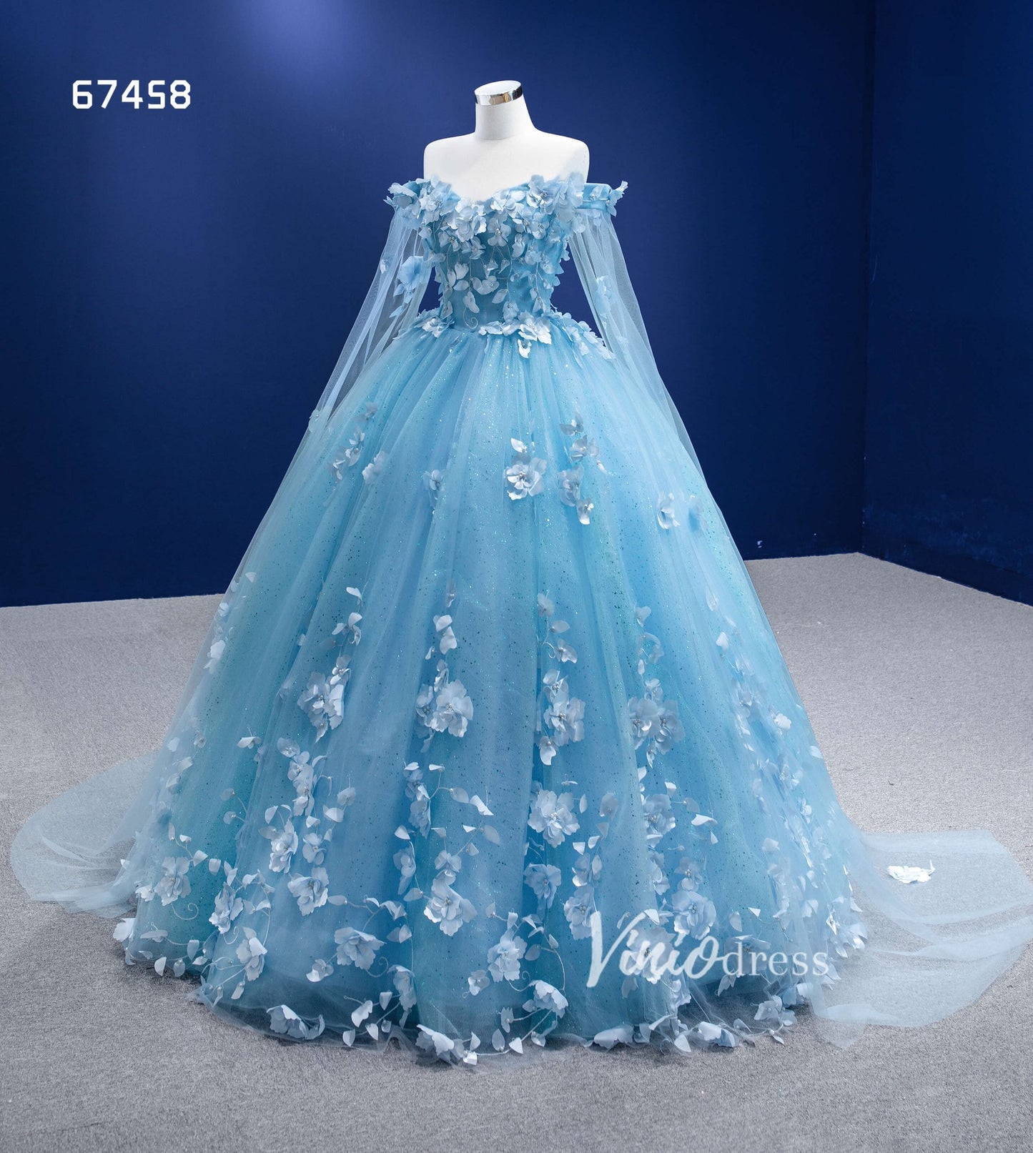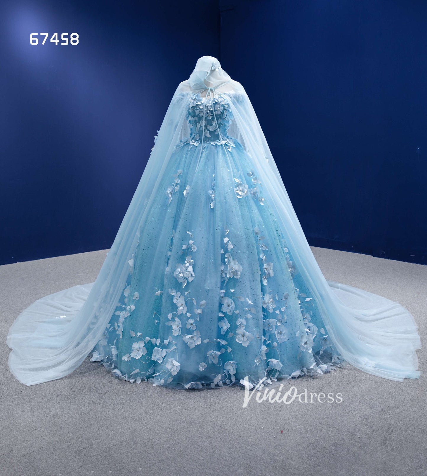 Vestido de quinceañera con flores en azul bebé, estilo princesa, con capa 67458