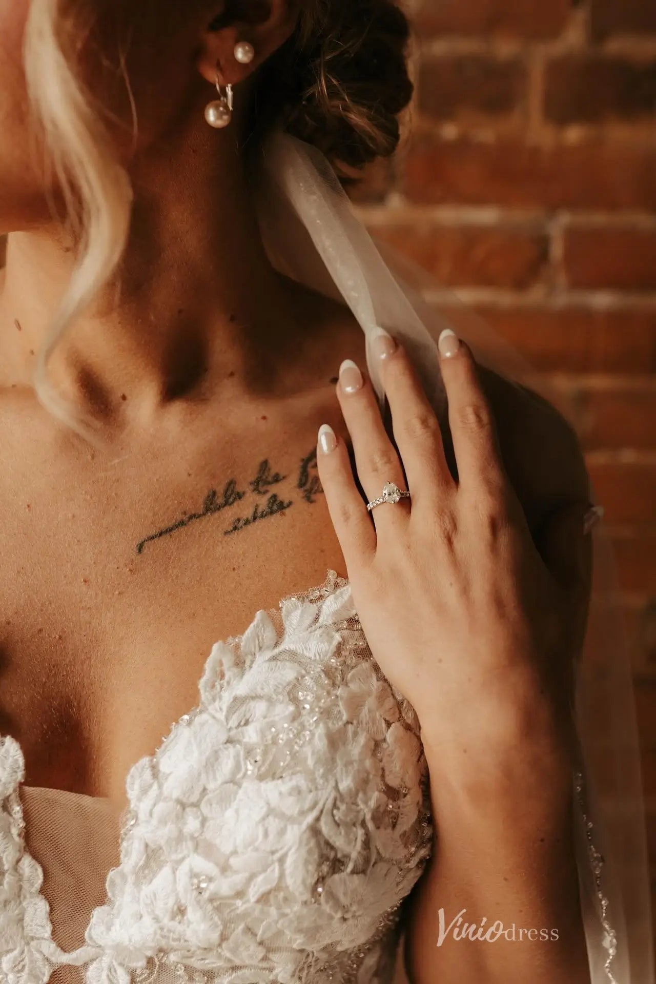 • Este hermoso vestido de novia de gasa presenta un corpiño transparente con apliques de encaje y cuentas de cristal. Terminado con cierre de botón de cristal.