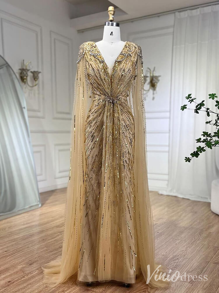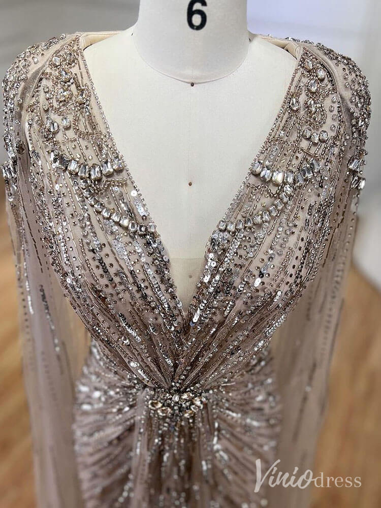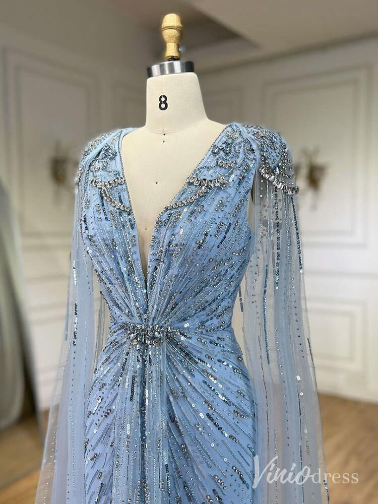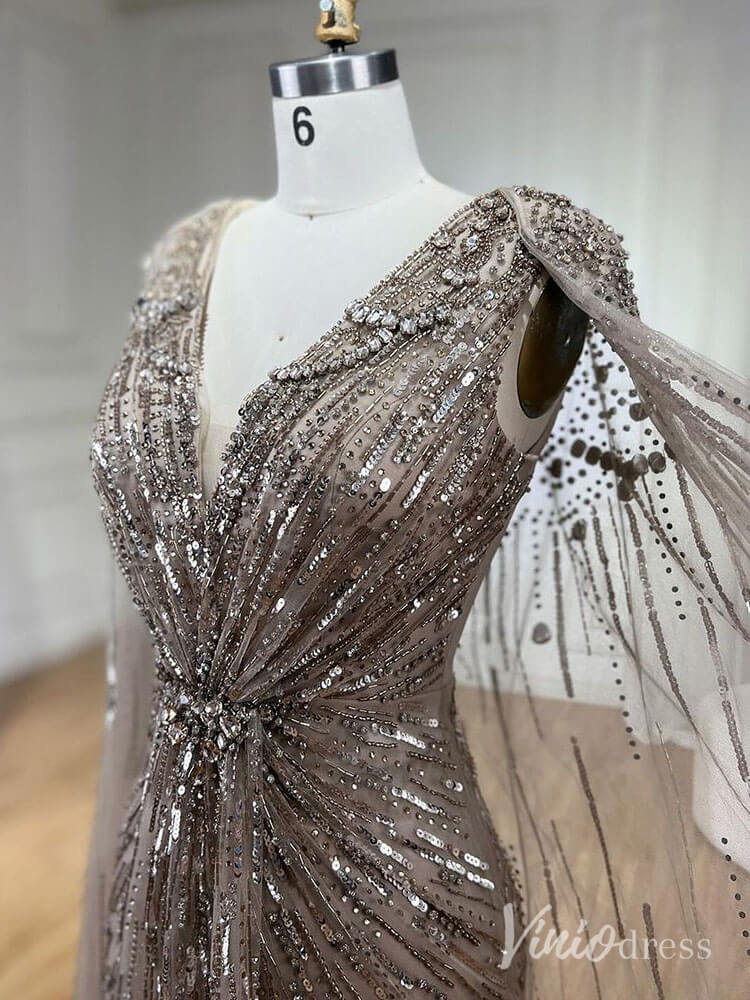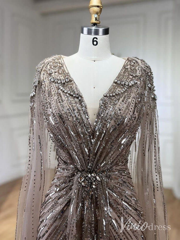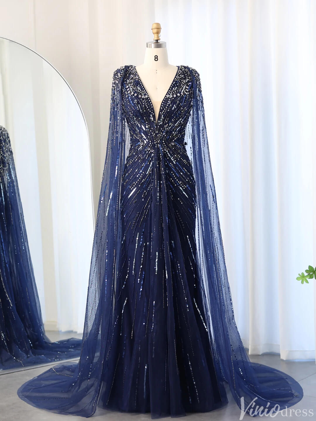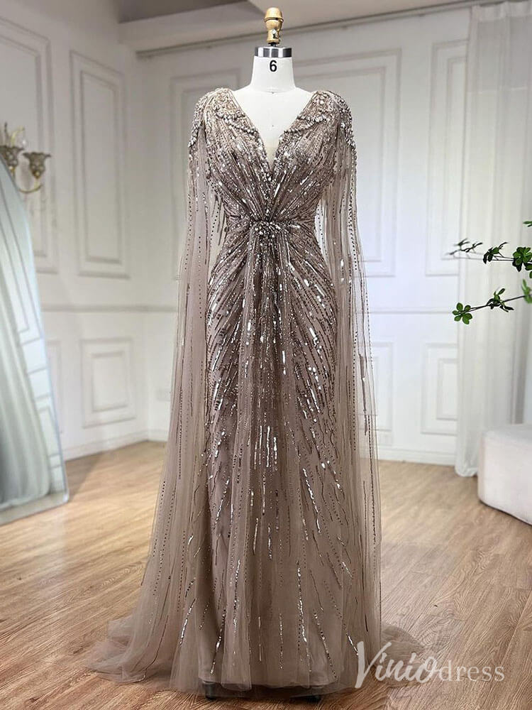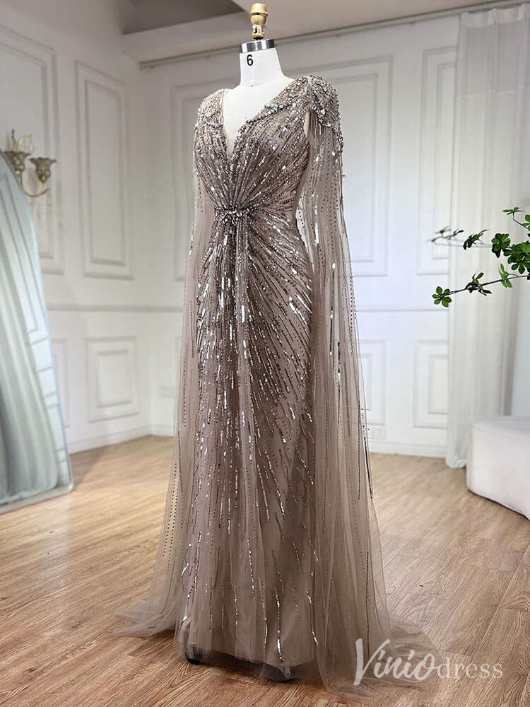 Vestido de fiesta con mangas estilo capa y escote en V con cuentas para invitada de boda AD1258