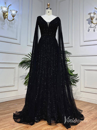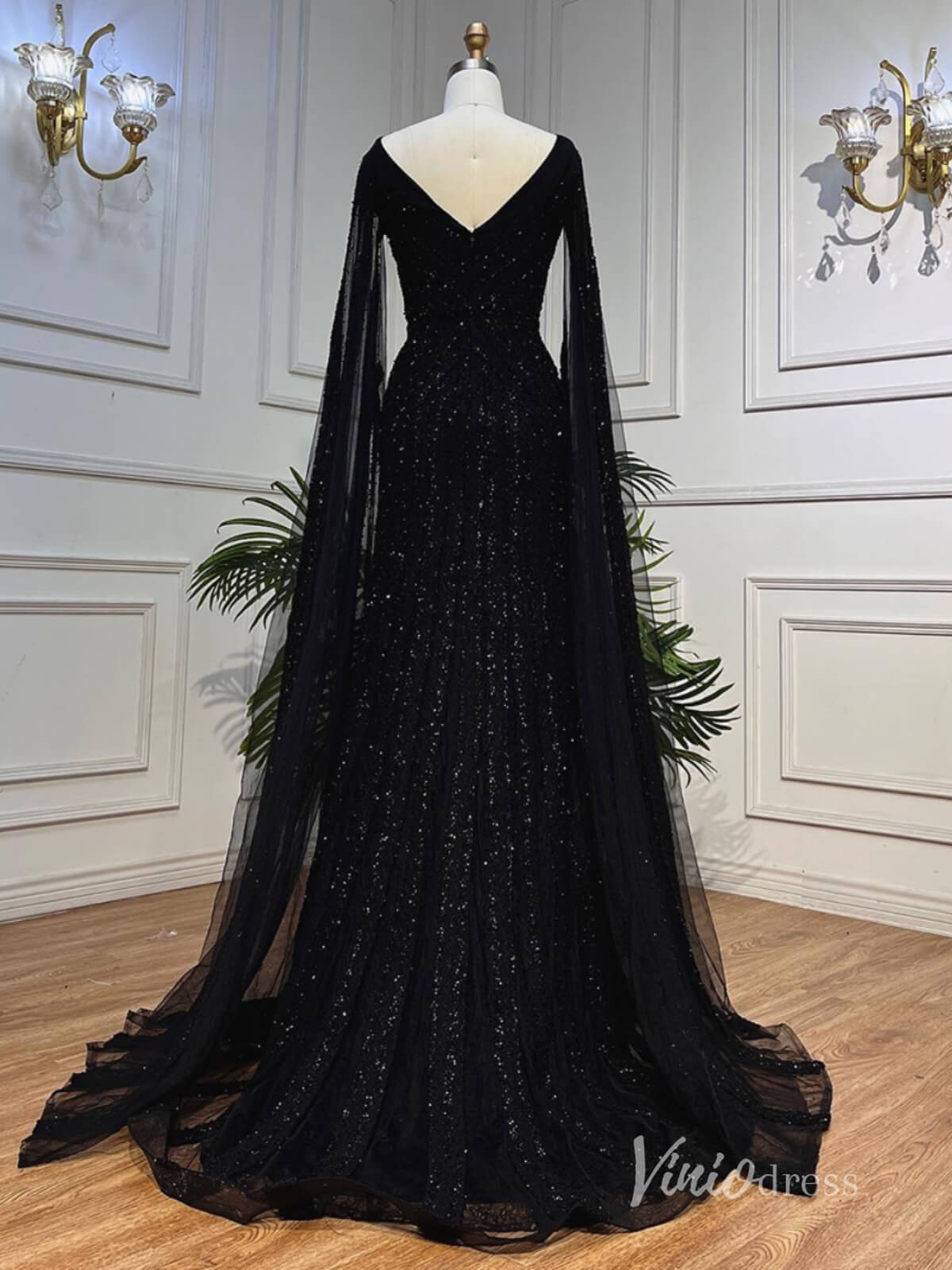 Este impresionante vestido de noche con cuentas negras llamará la atención en tu próxima ocasión especial. Con sus mangas extralargas, su escote en pico y su silueta en forma de A, se adaptará perfectamente a tus curvas y añadirá un toque de glamour. Un desfile perfecto o vestido formal.