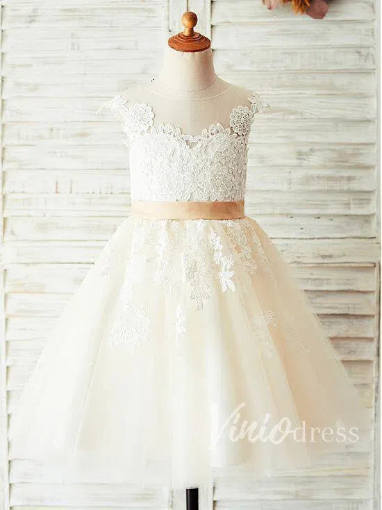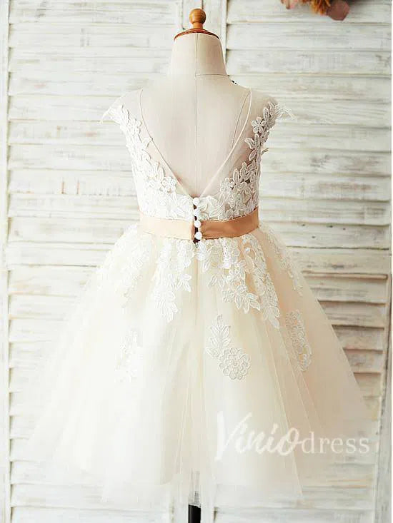 • Vestido de niña de flores de encaje champán barato con escote ilusión y manga corta.