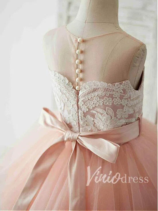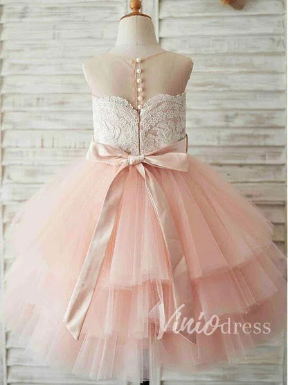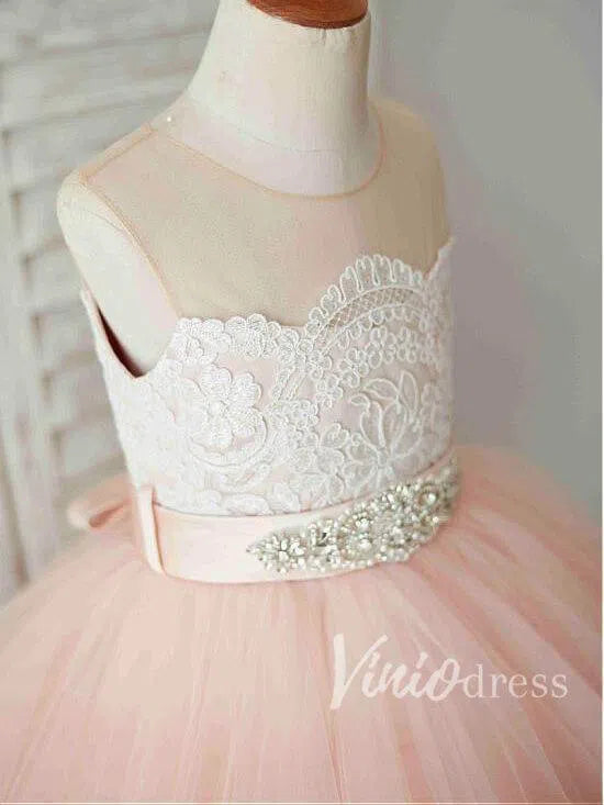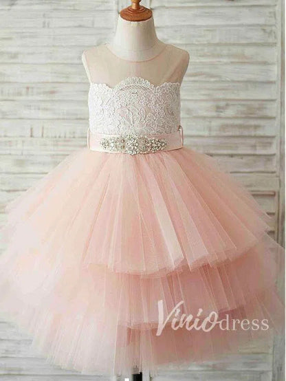 • Vestido rosa rubor para niñas pequeñas con corpiño de encaje y falda de tul escalonada. La faja con cuentas está incluida.