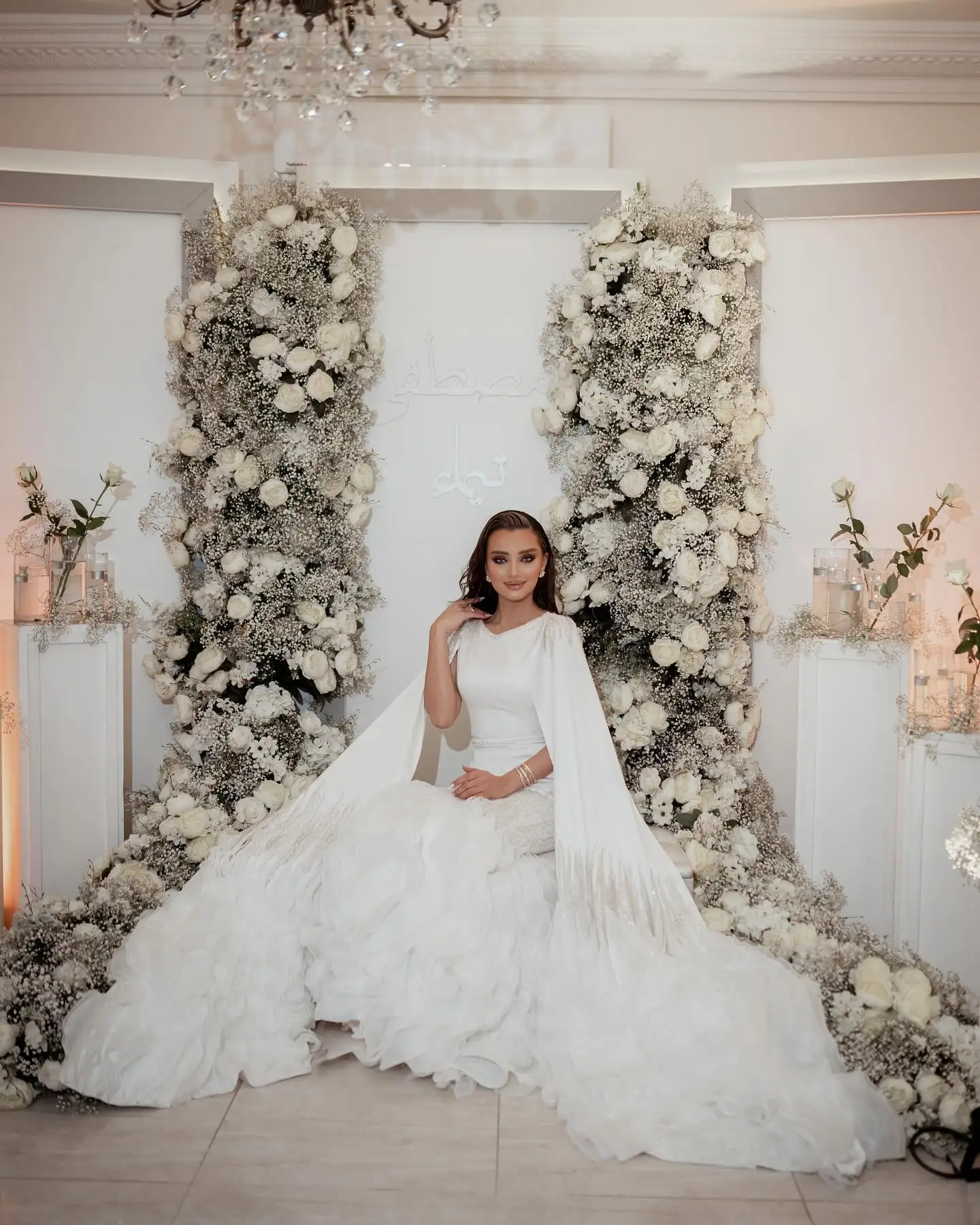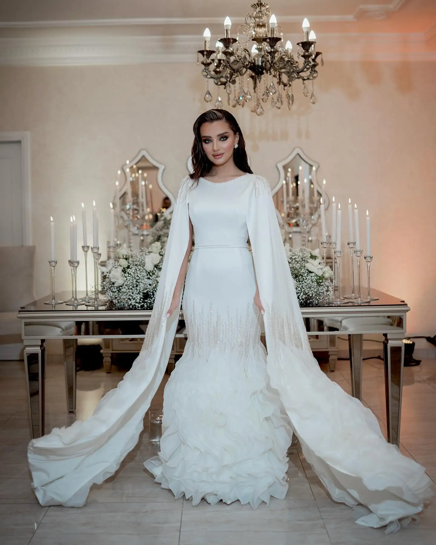 Elegante vestido de novia con mangas largas y volantes, vestido de noche con cuentas 20215